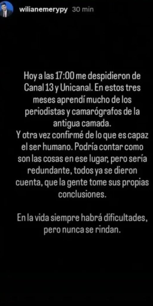 “Hoy a las 17:00 hs me despidieron de Canal 13 y Unicanal. En estos tres meses aprendí mucho de los peirodistas y camarógrafos de la antigua camada”, anunció William para luego arremeter contra quienes al parecer hicieron que su paso por el canal no sea el mas agradable.