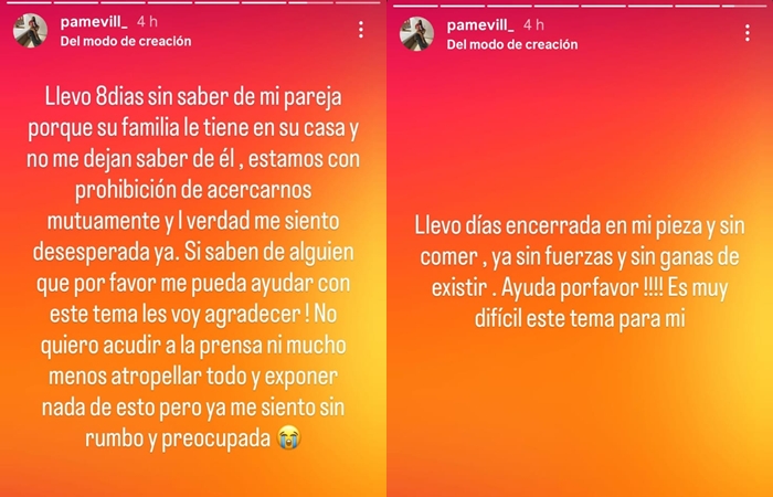 “Llevo días encerradas en mi pieza y sin comer, ya sin fuerzas y sin ganas de existir, ayuda por favor!! Es muy difícil este tema para mi”, escribió Pamela VIll quien lleva meses con esta disputa familiar.