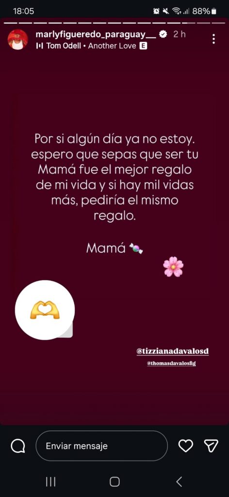 “Por si algún día ya no estoy, espero que sepas que ser tu mamá fue el mejor regalo de mi vida y si hay mil vidas mas, pediría el mismo regalo. Mamá”, firmó Marly este mensaje en redes sociales dedicado a sus hijos Tizi y Tomy.