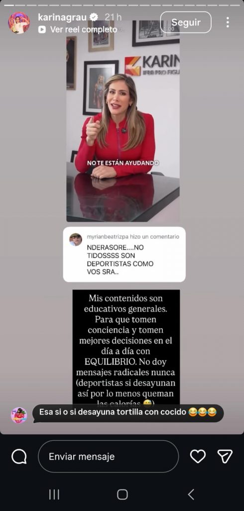 “Mis contenidos son educativos generales para que tomen conciencia y tomen mejores decisiones en el día a día con equilibrio. No doy mensajes radicales“, escribió Karina Grau reafirmando su compromiso con la información que emite a través de redes sin el objetivo de incentivar a restricciones estrictas sin supervisión médica.