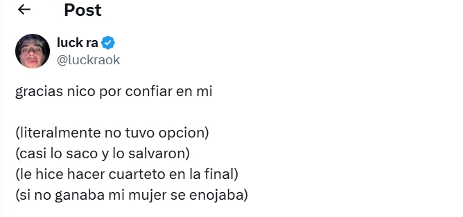 “Gracias nico por confiar en mi, (literalmente no tuvo opción), (casi lo saco y lo salvaron), (le hice hacer cuarteto en la final), (si no ganaba mi mujer se enojaba)“, escribió LuckRa confesando que “La Joaqui” interfirió en su decisión durante el reality show emitido por “Telefe”.