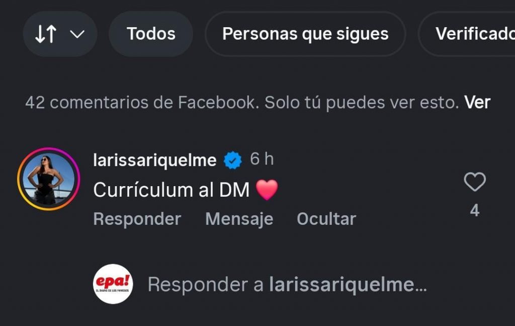 “Curriculum al DM”, escribió Lari respondiendo al titular en el que nos preguntábamos quien sería el padre del bebé que está buscando.