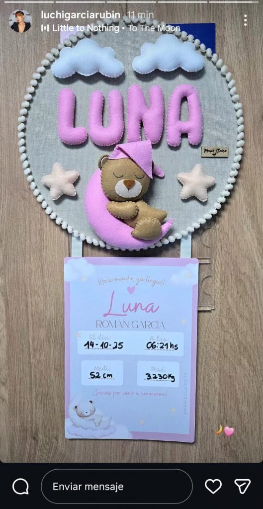 Pelusa Rubín, madre de Luchi, también publicó en su cuenta de instagram la ficha mencionada más arriba y uno de los primeros en visitar a la pequeña fue Tobías Rubín, primo de Luchi, quien también subió a instagram una foto de Luna descansando tras llegar a este mundo.